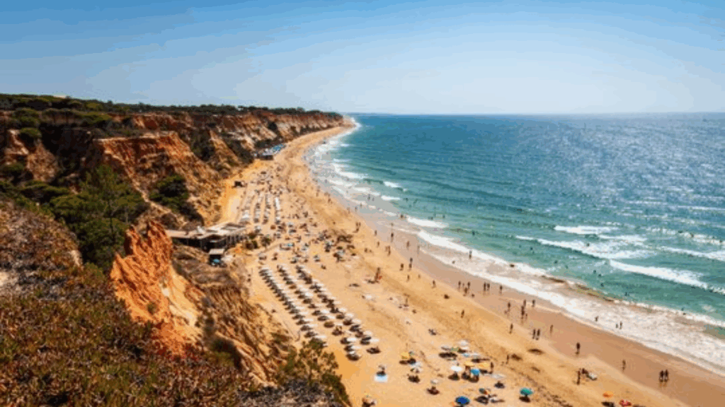 The Praia da Falesia in Albufeira is famous for its dramatic red and orange cliffs. The long stretch of sand seems endless, perfect for walks. The clear waters are calm and ideal for swimming. Sunsets here create stunning colors on the cliffs. Facilities include beach bars and sunbeds. It has Blue Flag status for safety and cleanliness. Praia da Falesia is one of the Algarve’s most picturesque beaches.
