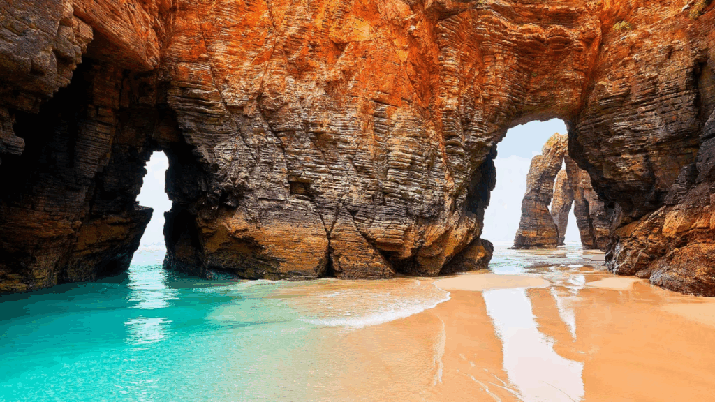 The Playa de las Catedrales in Galicia is famous for its dramatic rock formations. Natural stone arches and caves appear during low tide, resembling a cathedral. Visitors walk along the sand beneath towering cliffs. At high tide, the beach transforms into a wild, untamed landscape. It is a photographer’s paradise and a natural wonder. The Atlantic waters are powerful and refreshing. Playa de las Catedrales is Galicia’s most iconic beach.