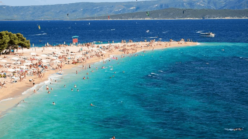 The Zlatni Rat Beach on Brač Island is Croatia’s most photographed beach. Its golden pebble spit extends into the Adriatic Sea. The shape of the beach shifts slightly with tides and winds. It is a favorite spot for windsurfing and kitesurfing. Pine forests provide shade along the shore. The clear waters are perfect for swimming and snorkeling. Zlatni Rat is Croatia’s iconic coastal landmark.