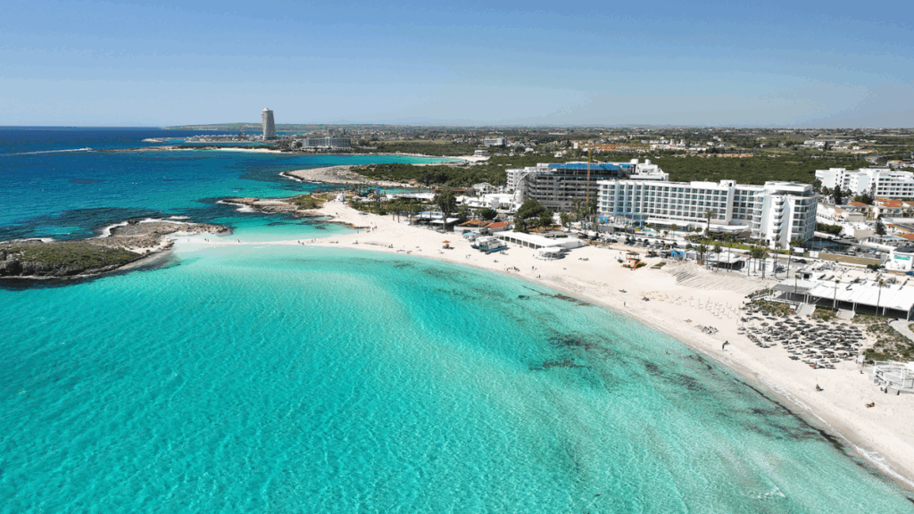The Nissi Beach in Ayia Napa is one of Cyprus’ most famous beaches. Its soft white sand and shallow waters attract families and partygoers alike. At low tide, a sand islet appears, adding fun for visitors. Beach bars create a lively summer atmosphere. Water sports like parasailing and jet skiing are popular. Its turquoise waters are perfect for swimming. Nissi Beach is the vibrant heart of Ayia Napa.