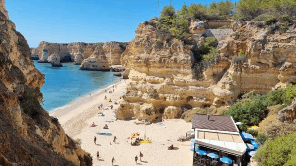The Praia da Marinha in the Algarve is one of Portugal’s most famous beaches. Golden cliffs frame its turquoise waters, creating breathtaking views. Accessible by steps, the beach feels secluded and dramatic. Snorkeling reveals rich marine life in crystal-clear water. It has been featured on postcards and travel magazines worldwide. The natural arches and rock formations are iconic. Praia da Marinha is the Algarve’s coastal masterpiece.