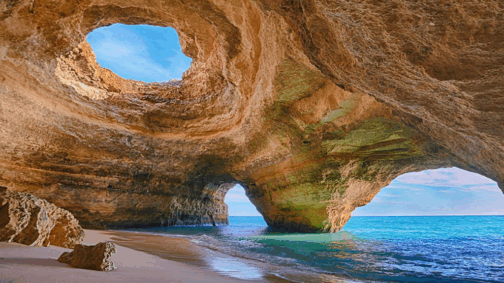 The Praia de Benagil in the Algarve is famous for its sea cave. The Benagil Cave, with its giant natural skylight, is one of Europe’s most photographed spots. Visitors reach it by boat, kayak, or swimming. The beach itself is small but charming. The waters are clear and perfect for snorkeling. Adventure seekers love exploring the nearby cliffs. Benagil is Portugal’s most iconic hidden gem.